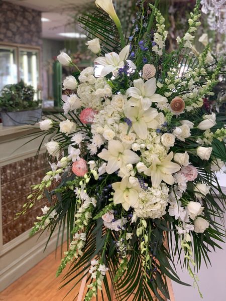 Grace In White Premium Funeral Spray Roses Orchids Hydrangeas Mums White Accent Blooms And Delicate Seashells
